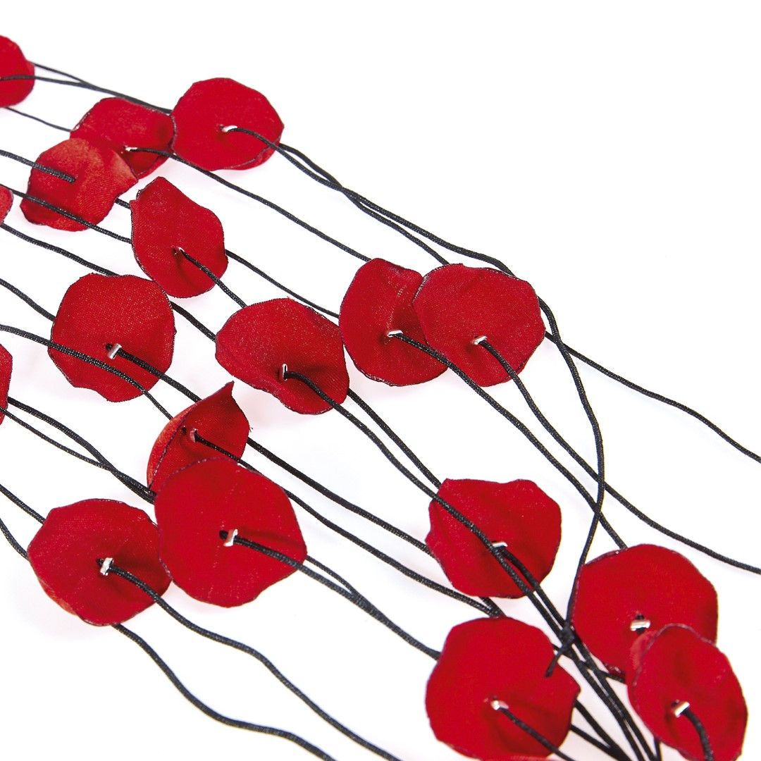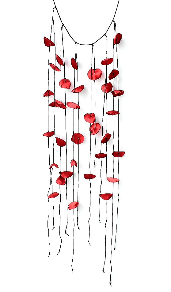 Χειροποίητα ροδοπέταλα φτιαγμένα από σατέν ύφασμα κρέμονται σε κηρόνημα